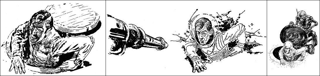 Mann stemmt sich aus Kanalschacht bzw. Erdloch hoch |
