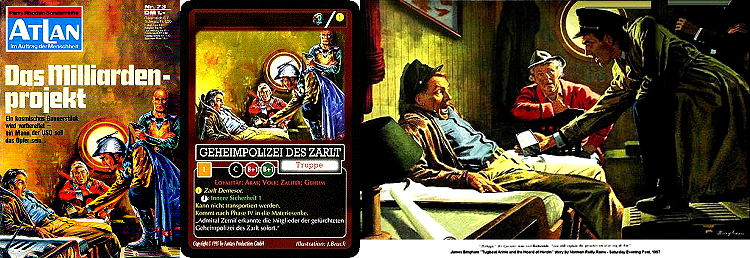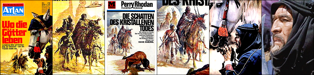 Die Gruppe im Hintergrund kommt auch sehr ähnlich in 3 vor, der Mann mit der Hakennase und sein Pferd sind von 4 übernommen (Filmfoto aus Lawrence von Arabien, der Schauspieler ist Anthony Quinn)