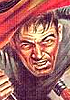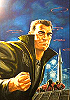 Raumfahrer mit verzerrrtem Gesicht und Strahlengewehr über der Schulter, siehe auch