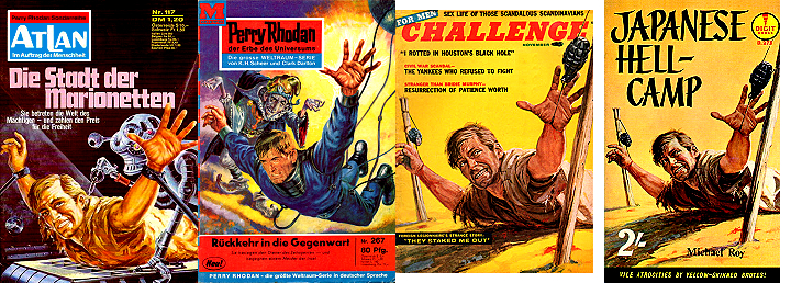 1 und 2 gleiches Bild, von 3 überarbeitet, in 4 und 5 gleiche Körperhaltung des liegenden Mannes, in 6 ist er seitenverkehrt