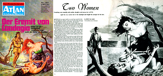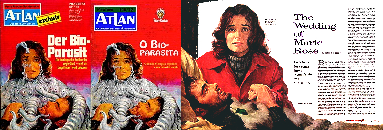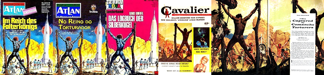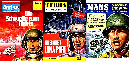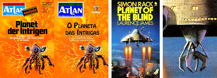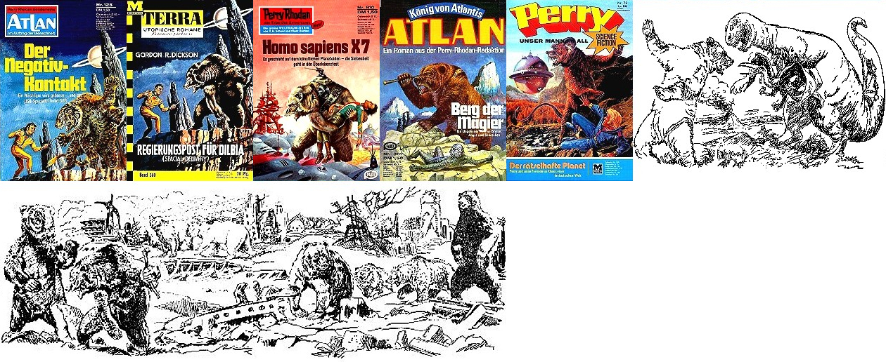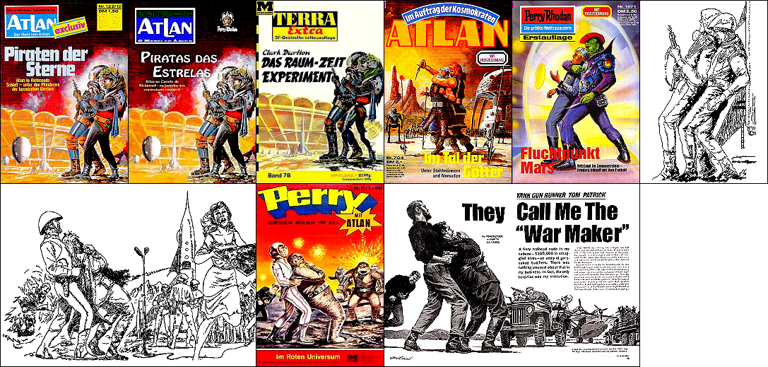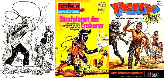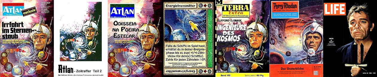 1 - 3 gleiches Bild wie 5, um Raumjäger ergänzt, der in 4 als kleiner Ausschnitt gezeigt wird. Das Motiv ist wohl von PR 19 inspiriert, wenngleich anders gezeichnet. Vorbild für den Raumfahrer ist aber Richard Burton als Hamlet.