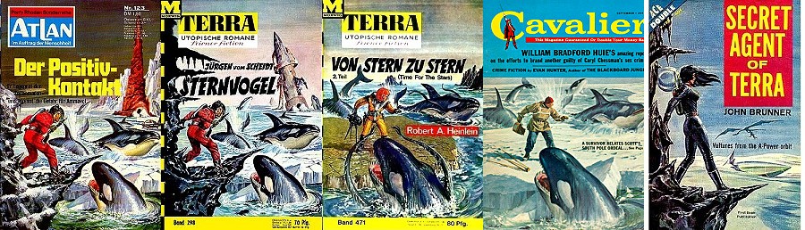 1 und 2 gleiches Bild, leicht überarbeitet (Rakete), 3 sehr ähnlich, 4 Vorbild für Nachzeichnung der Killerwale, 5 Vorbild für den Felsvorsprung in 1 und 2