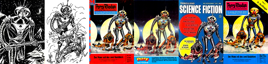 sehr ähnliches Motiv, 3 - 5 gleiches Bild, 5 mit überarbeitetem Hintergrund, 6 Nachzeichnung von 3 für Neu-auflage |