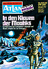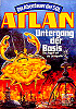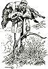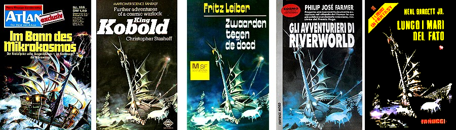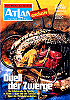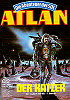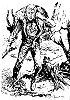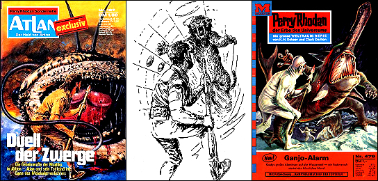 Mann wehrt sich mit einem Speer gegen ein Wesen mit Riesenauge bzw. mit einer Stange gegen einen Säbelzahntiger bzw. ein Außerirdischer mit Harpune gegen Fischwesen