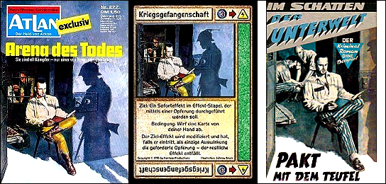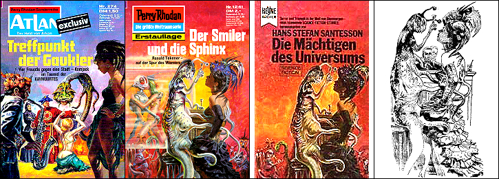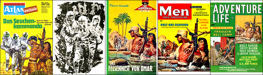 in 2 haben die Raumfahrer eine ähnliche Körperhaltung, das Paar mit dem Gewehr kommt auch in 3 vor und ist von 4 nachgezeichnet, in 5 gleiches Bild wie 4, leicht überarbeitet