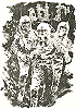 Mann und Frau, die ein Gewehr an einem Ast hängen haben, blicken auf Gruppe von Raumfahrern bzw. auf mit Flinten bewaffnete Araber