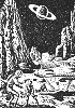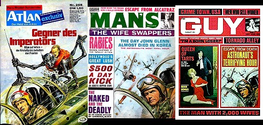 Männer aus Bild 2 und Hintergrund mit Mondlandschaft und Ringplanet aus Bild 3 wurden für die Zusammenstellung von 1 als Vorbild verwendet; 4 ähnliches Motiv mit gleicher Körperhaltung