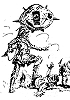 Schwertkämpfer setzt Fuß nach vorn bzw. steigt auf besiegten Gegner