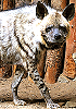 Mann in Rückenansicht mit Handwaffe blickt auf riesige Hyäne
