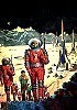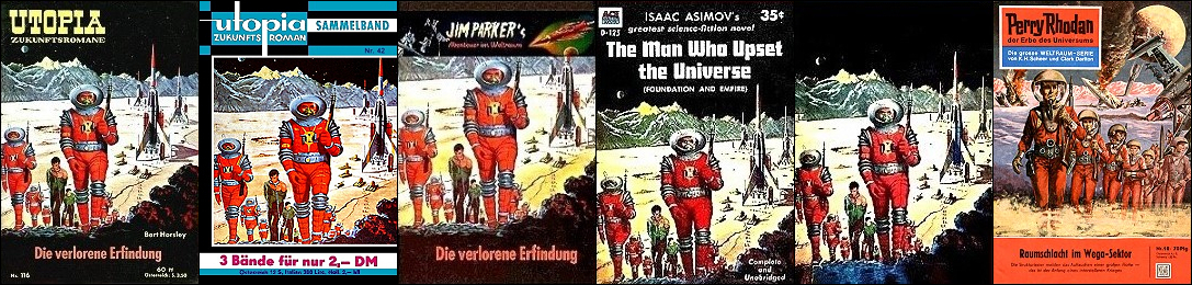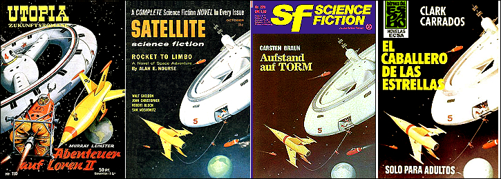 möglicherweise ist 1 von 2 inspiriert, weil ähnliche Konstellation mit Station, Rakete und Erde und das Raketenraumschiff hat auch genau die gleiche Farbkomposition mit gelbem Anstrich und rotem Ring wie in 2; 2 - 4 gleiches Bild