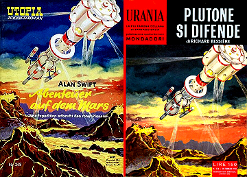 Rakete in Bild 2 fast identisch, aber gegenüber Bild 1 umgedreht und mit Frauenfigur ergänzt, 2 und 3 gleiches Bild