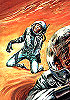 verzweifelt kniender Raumfahrer, hinter ihm Leuchterscheinung am Himmel |