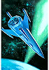 Raketenraumschiff über Erde, dahinter Lichterscheinung