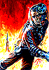 Mann im Raumanzug vor Feuer, auf die Seite blickend