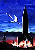 Mann blickt staunend zu einem affenartigen Außerirdischen, der auf einem Felszacken sitzt |
