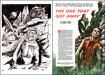 Raumfahrer vor Rakete, die auf Saturnmond gelandet ist |