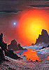 abgestürzter Raumfahrer kriecht in Landschaft unter roter Sonne von Raumschiff weg