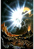 Mann hält Kristall in der Hand, im Hintergrund blutrote Sonne