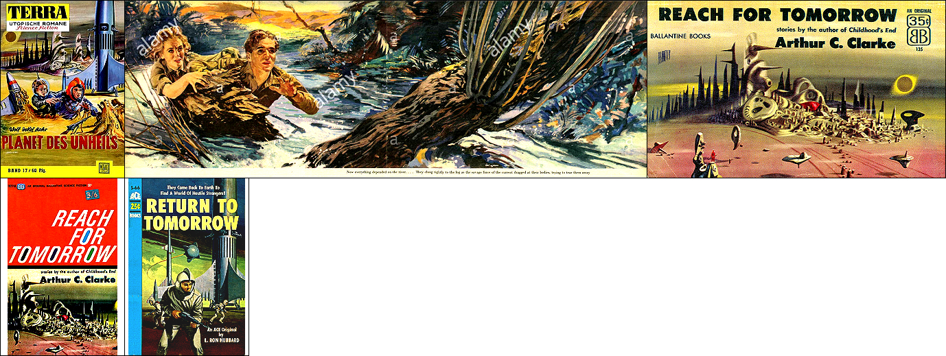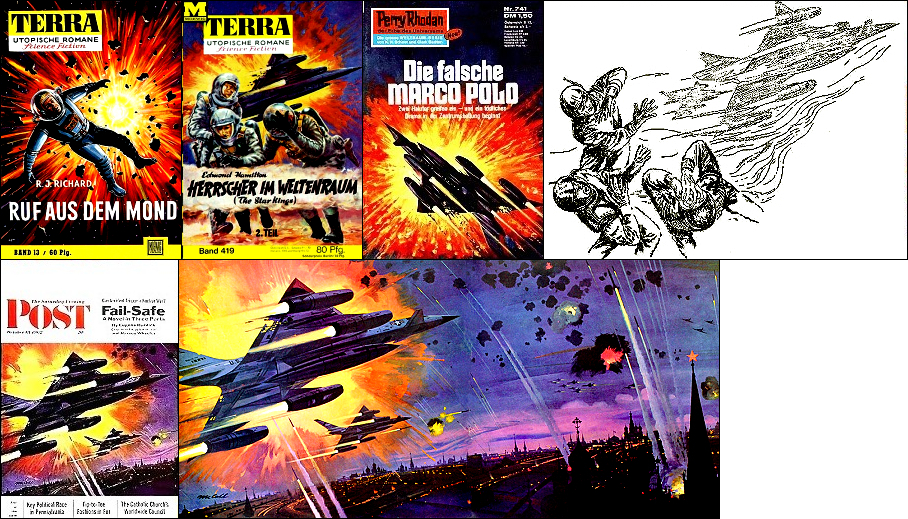 die Raumfahrer sind von 2 nachgezeichnet, der Hintergrund mit den eigenartigen zackigen Monolithen von 3 und die Rakete von 5