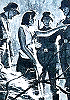 zwei Männer in Versteck hinter Erdhügel, im Hintergrund diskutiert Soldatengruppe mit Frau