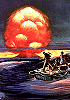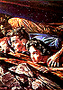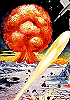 zwei Raumfahrer blicken entsetzt auf Projektil, das auf sie niederstürzt bzw. auf niederfallende Felsbrocken |