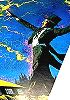 Mann schreitet mit erhobenen Händen vorwärts, eine elektrische Leuchtkugel beschwörend |