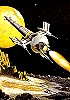Raumschiff über Mond, im Hintergrund volle Planetenscheibe |