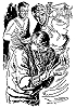 Der Mann im Vordergrund ist von 2 nachgezeichnet (man beachte besonders den Gesichtsausdruck und die Fingerhaltung), restliches Bild unterschiedlich, 2 und 3 gleiches Bild, seitenverkehrt, der Mann mit der Leuchtkugel hat die gleiche Körperhaltung wie in 4 |