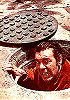 Mann schaut aus kreisrunder Öffnung bzw. Treppenschacht und hält sich mit einer Hand am Rand fest |
