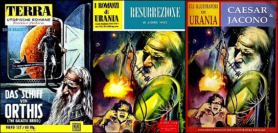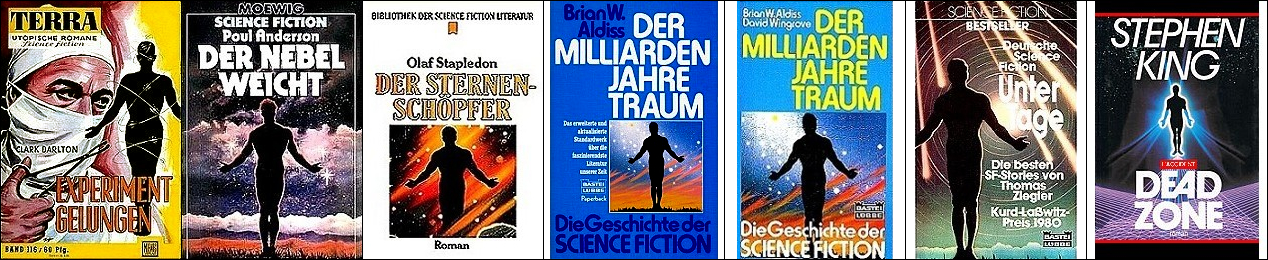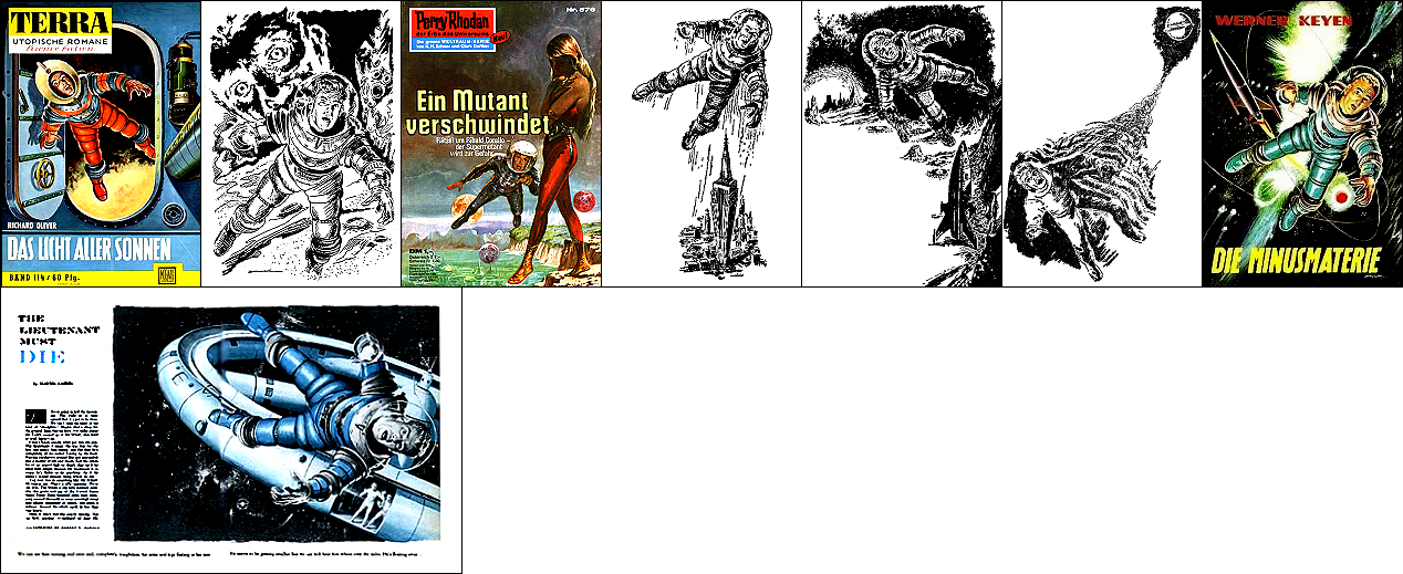 ähnliche Motive, in 2 Raumfahrer und Schott von 1 übernommen, 3 davon stark inspiriert, 4 Neuinterpretation von 2 für Neuauflage, 6 Neuinterpretation von 5 für Neuauflage, 7 und 8 gleiches Bild, 9 und 10 sehr ähnlich |