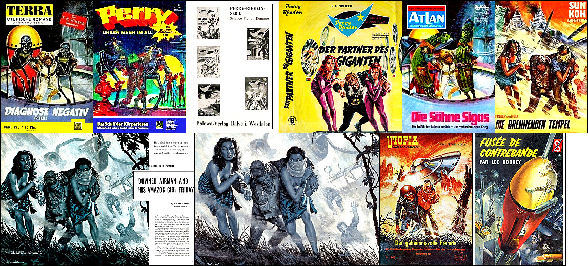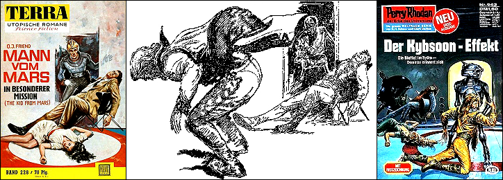 1 - 2 gleiches Bild, Figuren überarbeitet, 3 - 5 gleiche Perspektive. Vorbild für Nachzeichnung ist 6 bzw. 7, in 8 taucht das Motiv nochmals als Zweiergruppe auf, das Raumschiff in 9 dürfte als Inspiration für das Gerät in 1 gedient haben (man beachte die Farbkombination) |