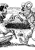 sehr ähnliches Motiv, von 2 nachgezeichnet, 3 und 4 mit etwas anderer anderer Haltung beim sitzenden Mann, aber untereinander sehr ähnlich in s/w und Farbe, von 5 nachgezeichnet |