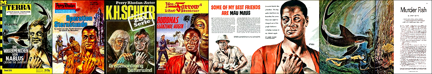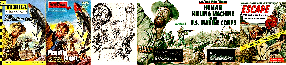 1 - 2 gleiches Bild, 3 gleiche Szene schwarzweiß, 4 Mann mit Waffe ähnlich, in 5 gleiche Szene, aber mit Außerirdischen, 7 Vorbild für Nachzeichnungen |