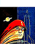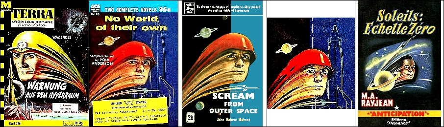 1 - 2 gleiches Bild, leicht überarbeitet (Rakete verändert), 3 bzw. 4 ist Vorbild für den oberen Raumfahrer, in 5 ist der Raumfahrer gleich wie der untere in 1, 6 sehr ähnlicher Raumfahrer, senkrecht gespiegelt |