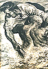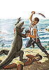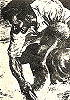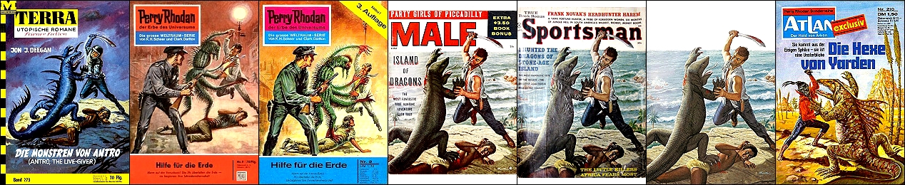 gleiche Körperhaltung des kämpfenden Mannes, 3 Nachzeichnung von 2 für Neuauflage, 4 - 6 gleiches Bild, Vorbild für Nachzeichnungen des kämpfenden Mannes und für das ganze Bild in 1, in 7 hat der Mann zwar eine andere Körperhaltung, aber die Echse ist sehr ähnlich |