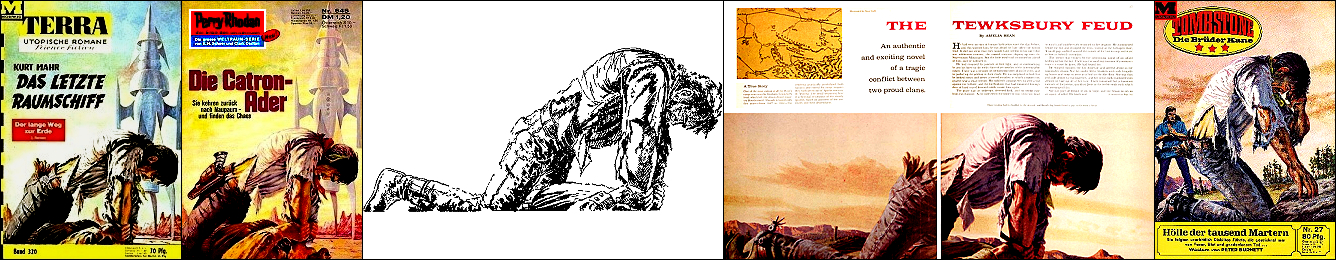1 und 2 gleiches Bild, leicht überarbeitet (Mann in 2 mit Pistole am Gürtel ergänzt), 4 Vorbild für Nachzeich-nung, 5 ähnlicher Mann, aber kniend |