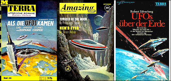 ähnliches Motiv, die UFOs in 1 sind möglicherweise von 2 inspiriert, 3 ähnliche Perspektive, aber Flugobjekte anders gezeichnet