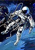 fliegender Raumfahrer mit spiegelndem Helm, Tornister vor der Brust und angewinkelten Beinen, siehe auch
