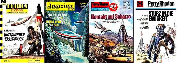 Das Diskusraumboot ist von 2 nachgezeichnet, die Raketenraumschiffe sind geringfügig ähnllch |