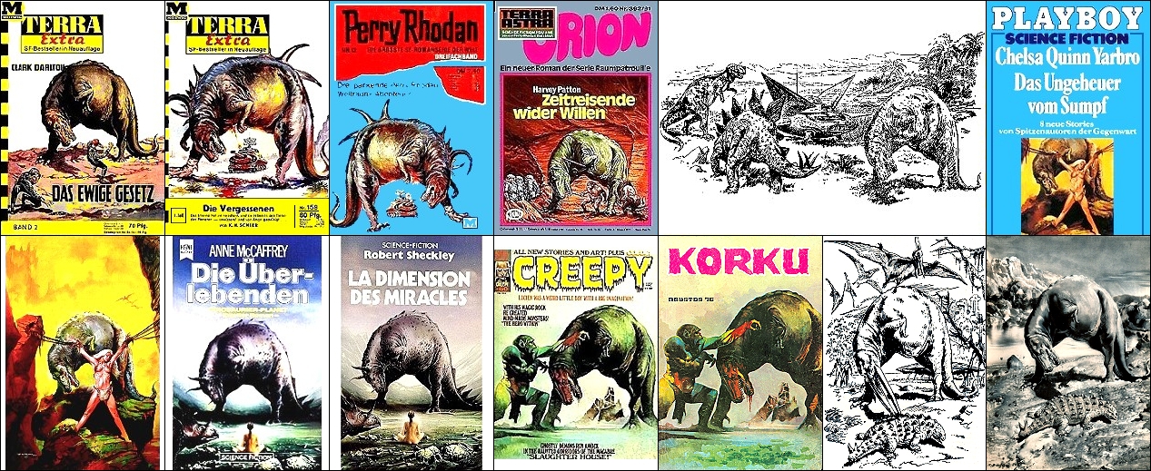 ähnliches Motiv, 2 und 3 gleiches Bild, seitenverkehrt mit überarbeitetem Hintergrund, 6 - 7, 8 - 9, 10 - 11 gleiches Bild, in 12 Saurier mit Schnabel ergänzt, 13 Vorbild für Nachzeichnungen |