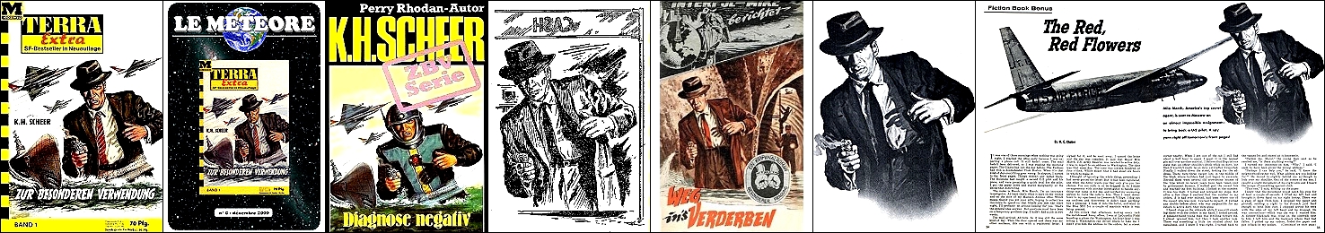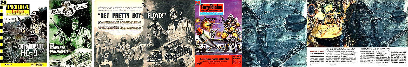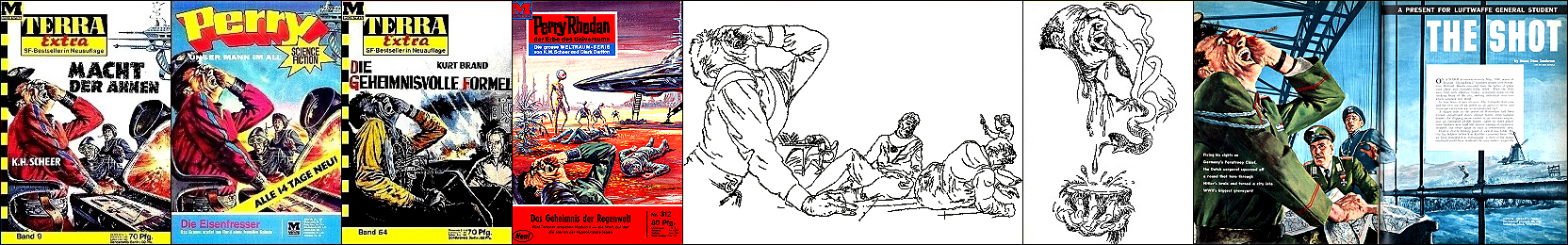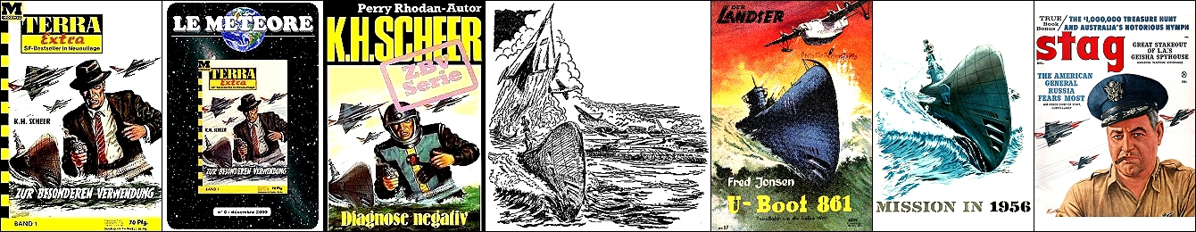 U-Boot identisch in Farbe und schwarzweiß gezeichnet, restliches Bild unterschiedlich, 1 und 2 gleiches Bild, 3 davon überarbeitet, 6 Vorbild für Nachzeichnungen des U-Boots, die Jetjäger in 1 - 3 sind eine Übernahme von 7 |