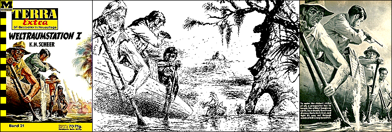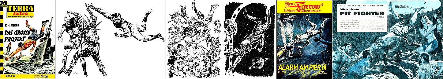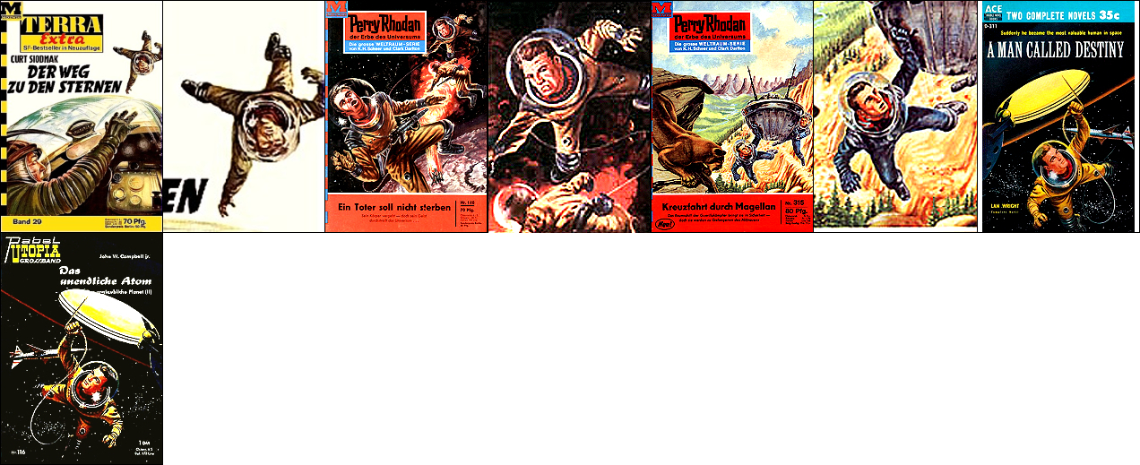 der schwebende Raumfahrer im Hintergrund kommt mit ähnlicher Körperhaltung umgedreht auch in 3 und 5 vor und ist von 7 bzw. 8 nachgezeichnet, 7 - 8 gleiches Bild, seitenverkehrt |