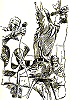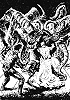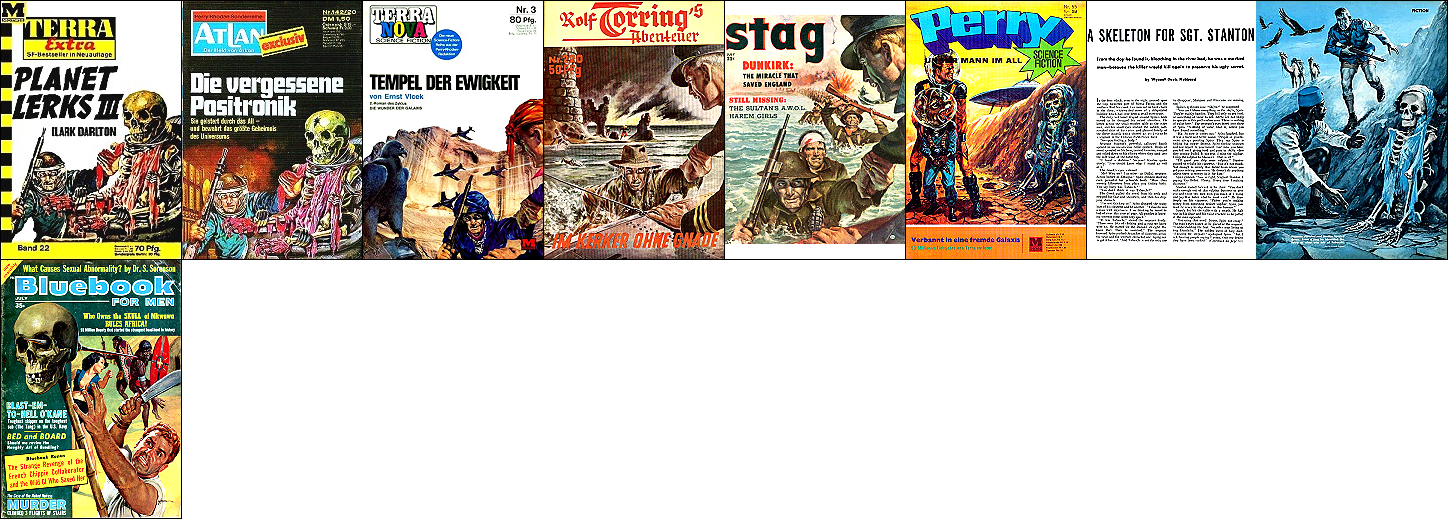 1 gleiches Bild wie 2 mit überarbeitetem Hintergrund, der Mann erscheint auch in 3 und 4 und ist von 5 nachgezeichnet, das Skelett erscheint auch ähnlich in 6 und ist von 7 inspiert, der Schädel von 8 übernommen (man beachte die Zahnstellung) |