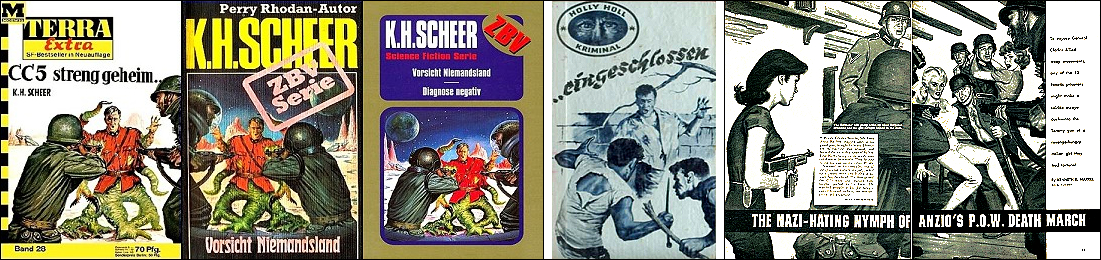 1 - 3 gleiches Motiv, seitenverkehrt mit überarbeitetem Hintergrund, der Gestaltwandler kommt auch in 4 vor, die beiden Soldaten sind von 5 nachgezeichnet |