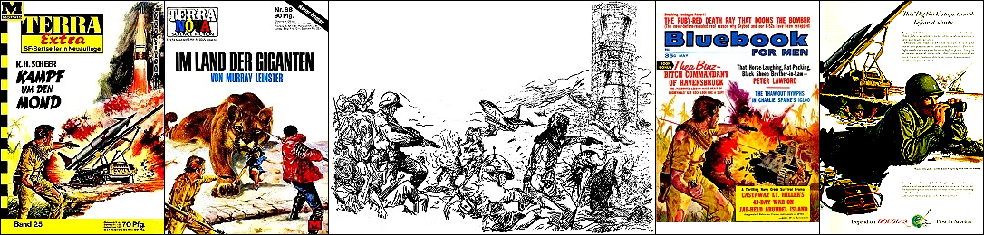 Mann in 1 - 3 fast identisch von 4 nachgezeichnet, restliches Bild unterschiedlich, die Raketenlafette in 1 ist von 5 nachgezeichnet |