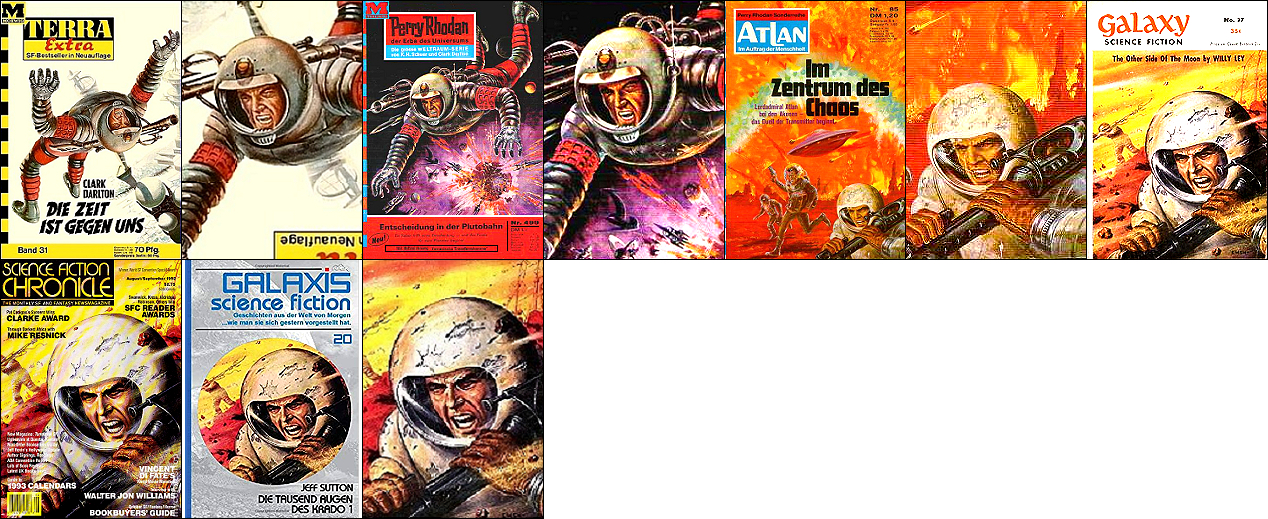 Raumfahrer in 1 von 3 umgedreht übernommen und mit anderem Hintergrund ergänzt; Gesicht in 1, 3 und in 5 von 7 nachgezeichnet, restliches Bild unterschiedlich. 1 - 2, 3 - 4, 5 - 6, 7 - 11 gleiches Bild, 2, 4 und 6 Ausschnitte |