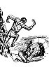 Der Roboter kommt auch in 2 vor, seine Körperhaltung ist vom liegenden Mann in 3 nachgezeichnet, restliches Bild unterschiedlich |