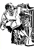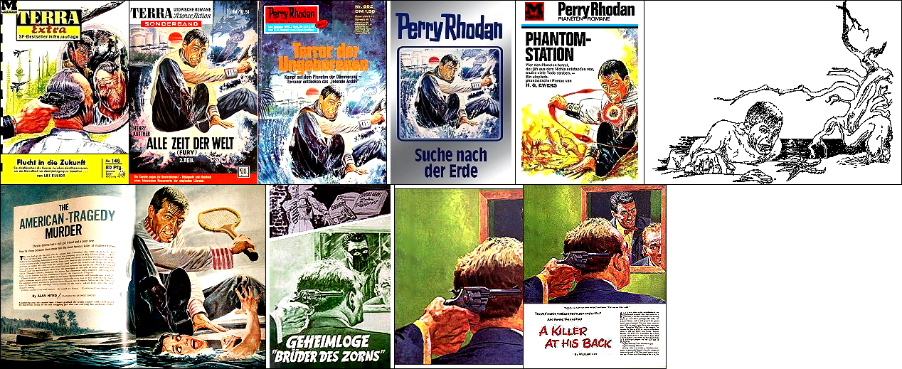 Kopf des Mannes fast identisch, 1 von 7 als Collage übernommen, 2 - 4 gleiches Bild, von 7 nachgezeichnet. Der Mann ohne Gesicht in 1, dem die Pistole an den Hinterkopf gehalten wird, kommt auch in 8 vor und ist von 9 nachgezeichnet. |