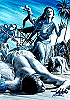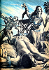 am Boden liegender und vor Diskusraumboot flüchtende Eingeborene |