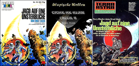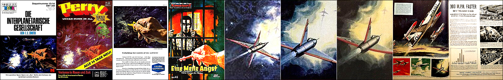 1 - 2 gleiches Bild, in 2 um Deltajäger und Schlangenkopf ergänzt, die Hand ist von 3 entnommen und als Collage eingebaut, in 4 findet sich eine Nachzeichnung der Hand mit dem Schlüssel, der Jäger links unten ist samt der Wolke dahinter von 6 bzw. 7 nachgezeichnet, 6 - 7 gleiches Bild